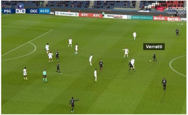其实就是后防线球员站好位置,中前场球员切割巴黎圣日耳曼的球路这样简单。像比赛进行到第42分钟的时候,巴黎中场断球成功,当时尼斯的后防线领袖丹特不在自己的位置,但4个位置最靠后的队友组成了很紧凑的防线,中场有人挡住维拉蒂往侧翼分球的路线,这样维拉蒂如果往前传递,皮球就会掉进人堆里。